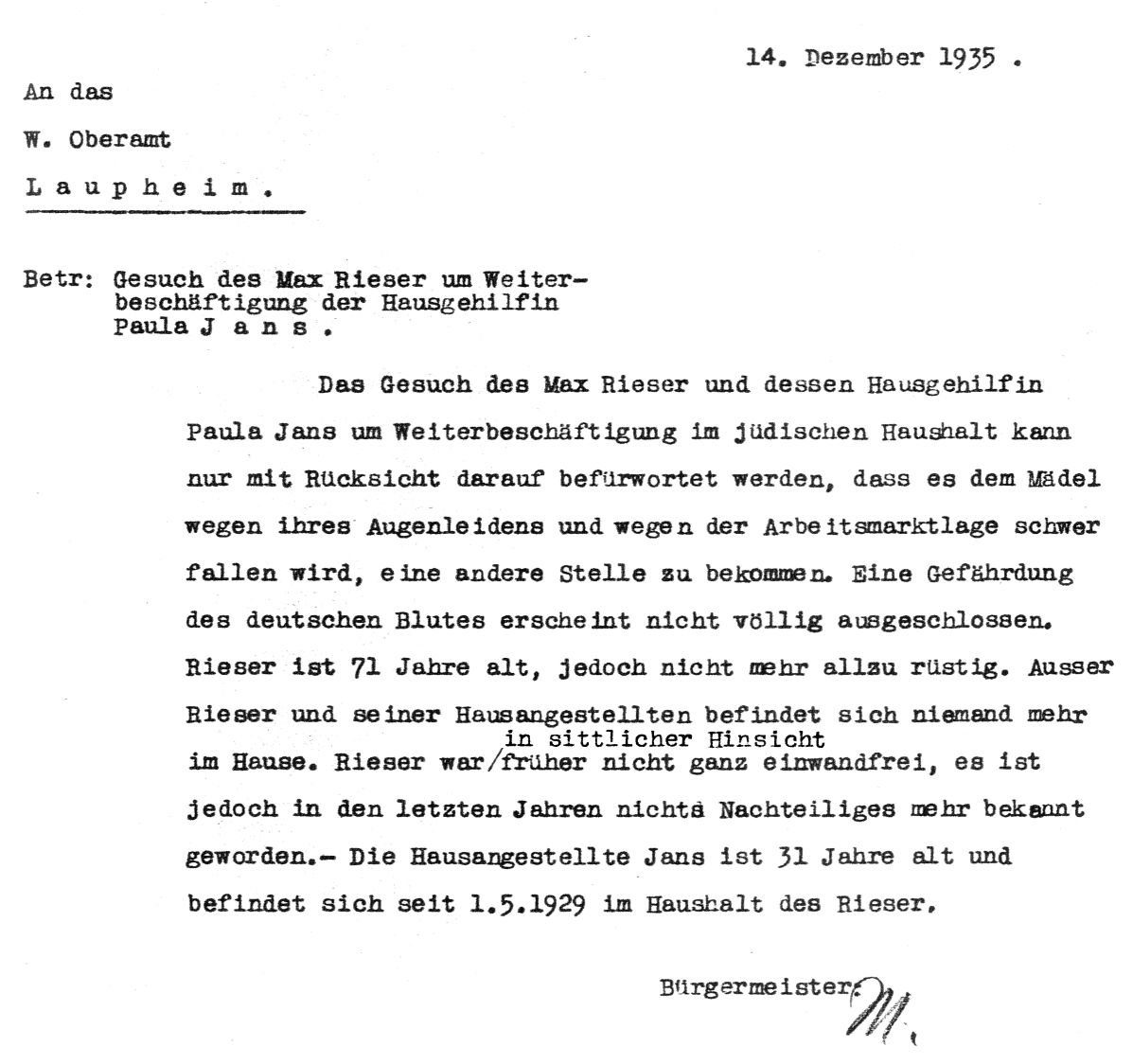 So dürfte der siebzigjährige Max Rieser ab 1934 allein in Laupheim in der Radstraße 35 gewohnt haben. Dies bestätigt die Reaktion auf sein Gesuch um Weiterbeschäftigung seiner langjährigen Hausgehilfin Paula Jans. Im September 1935 war das im Original lautende Gesetz zum Schutz des deutschen Blutes und der deutschen Ehre“ verabschiedet worden, im Paragraph 3 hieß es: Juden dürfen weibliche Staatsangehörige deutschen oder artverwandten Blutes unter 45 Jahren nicht in ihrem Haushalt beschäftigen.“ Ausnahmen bedurften der Genehmigung, die hier unter Vorbehalt vom Bürgermeister Ludwig Marxer – fanatischer Antisemit, Mitglied der NSDAP und seit 1935 Bürgermeister in Laupheim befürwortet wurde. In seiner Stellungnahme an das Oberamt Laupheim, die auf der vorigen Seite abgedruckt ist, äußerte er sich entsprechend diffamierend über den Antragsteller Max Rieser, den Ludwig Marxer wohl kaum gekannt haben durfte, da er selbst aus Saulgau stammte und erst kurze Zeit im Amt war.