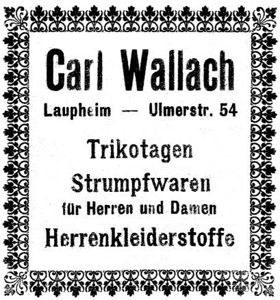 2. Kalman Wallach, Textilwarengeschäft in Laupheim, Kapellenstraße 42. Das Geschäft ist aufzulösen. Für die Sicherstellung der Versorgung ist es nicht erforderlich.